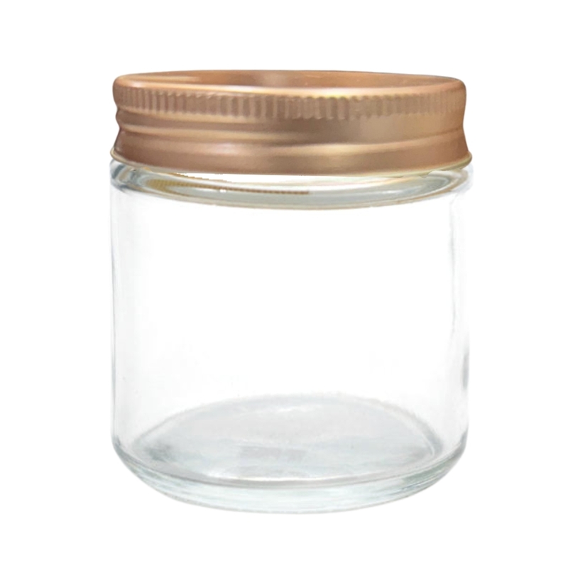 - Clear 120ml round glass jar with a golden cap