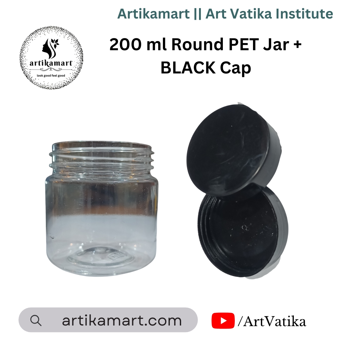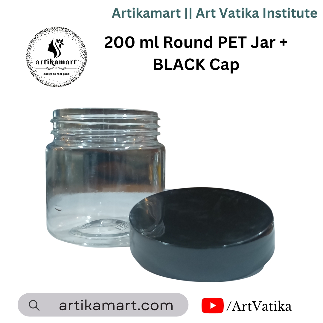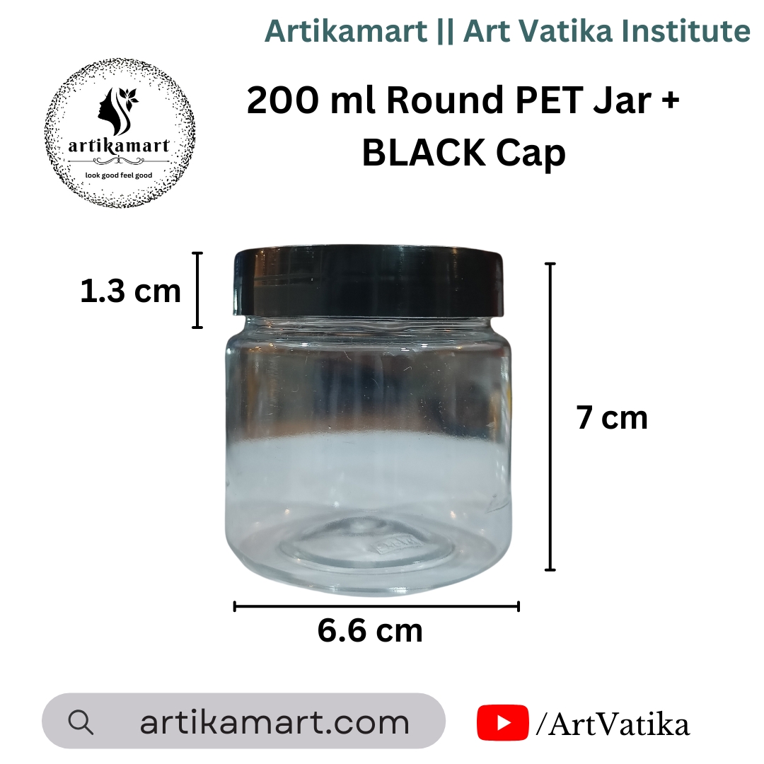 - How to use: Simply transfer your desired cosmetic product into the 200ml Clear Round PET Jar using a spatula or by carefully pouring it in. Secure the jar with the black plastic cap to maintain product freshness and prevent leakage.