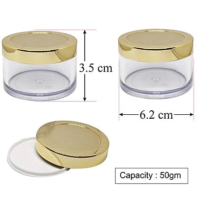 - Stylish organization: Our 50ml acrylic san jar combines elegance and functionality, providing an excellent storage solution for your essentials. The transparent body allows you to showcase your items, while the gold cap adds a touch of luxury to your space.